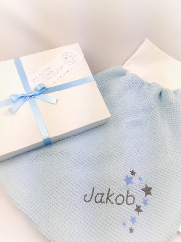 STRAMPELSACK aus Waffelpique "Sternenregen" mit Wunschnamen & Geschenkkarton - Farbwahl