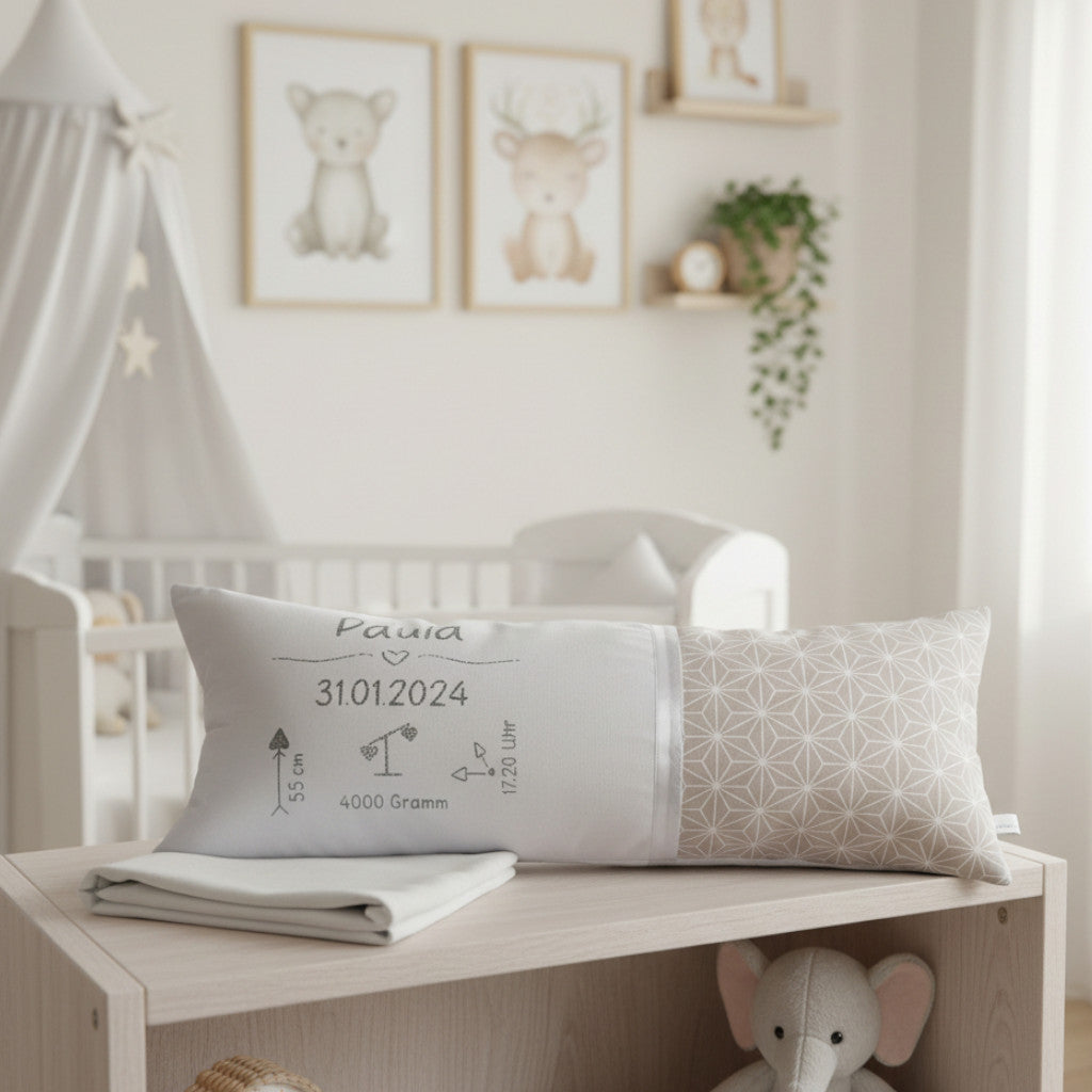 Die individuellen Geburtsdaten machen jedes Kissen einzigartig und verleihen ihm eine ganz persönliche Bedeutung, die ein Leben lang bleibt. Ob als dekorativer Blickfang im Kinderzimmer oder als bleibende Erinnerung für später – dieses Geburtskissen verbindet Herz, Gefühl und Erinnerung auf einzigartige Weise.