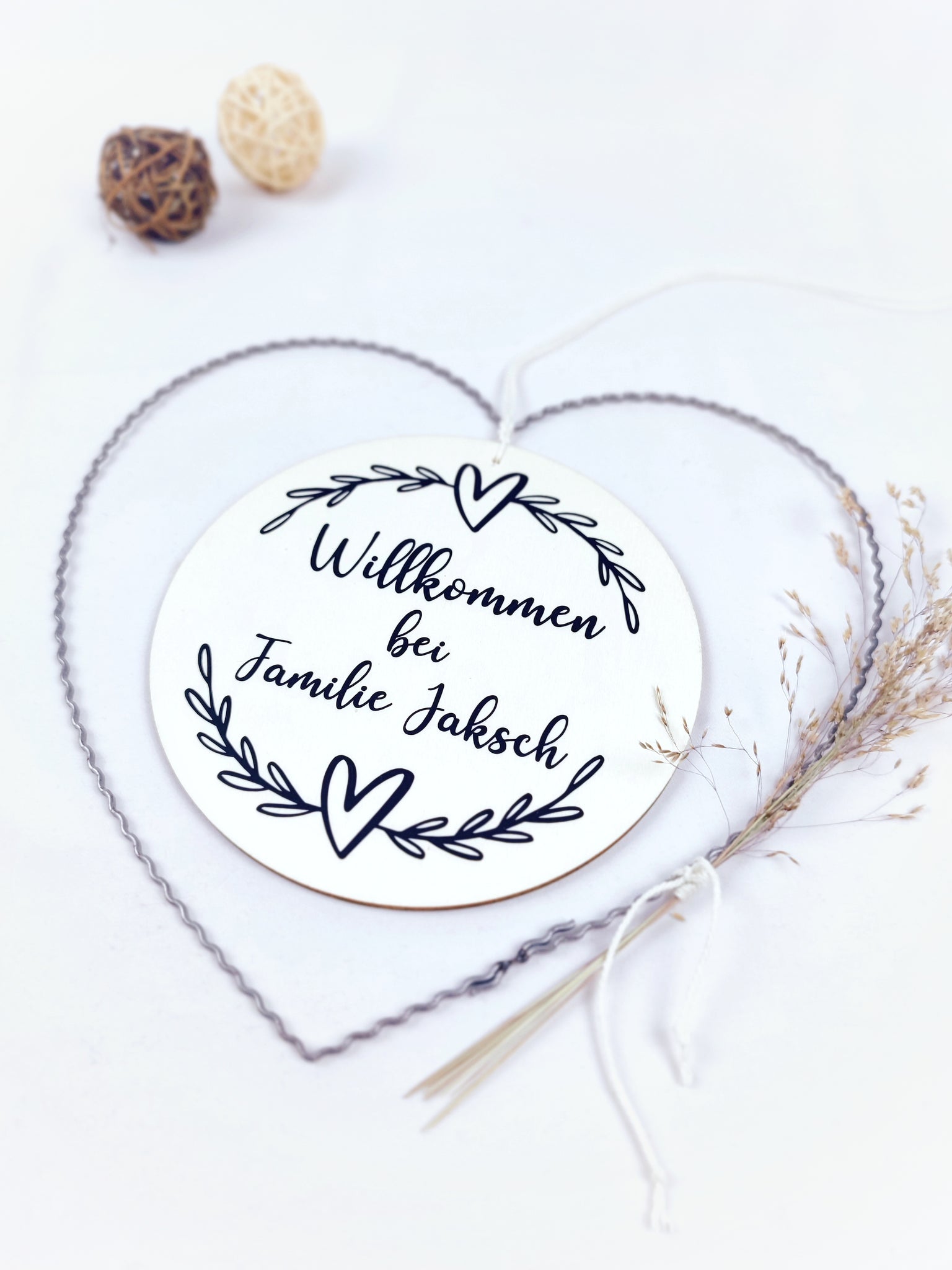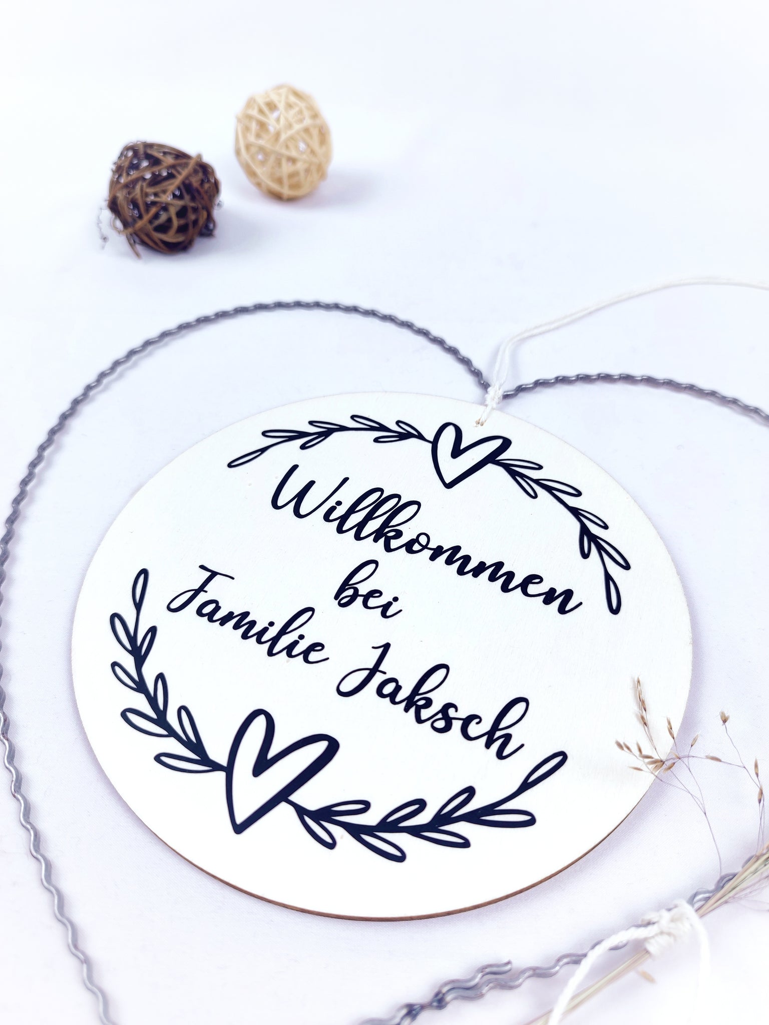 Für die Personalisierung ist ein Familienname oder bis zu 4 Vornamen vorgesehen, d. h. beim Personalisierungswunsch geben Sie NUR den Familiennamen oder die Vornamen an. Der Gesamttext lautet dann wie folgt: Willkommen bei Familie (Familienname) / Willkommen bei (Vornamen).