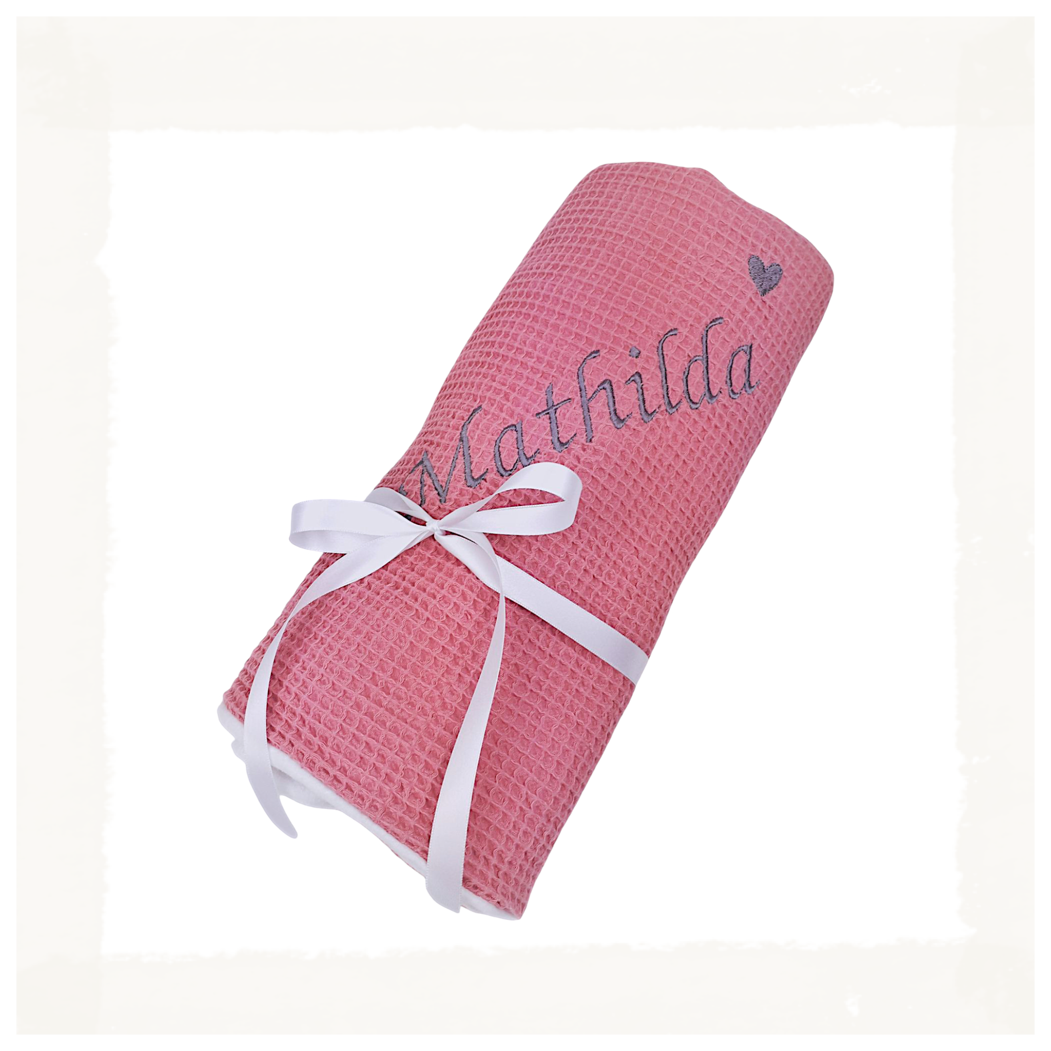Als ganz besonders Highlight, kann die Kuscheldecke mit einem Wunschnamen personalisiert werden. Farbwünsche für die Bestickung können gerne angegeben werden, ansonsten wird die Garnfarbe der Stofffarbe angepasst.