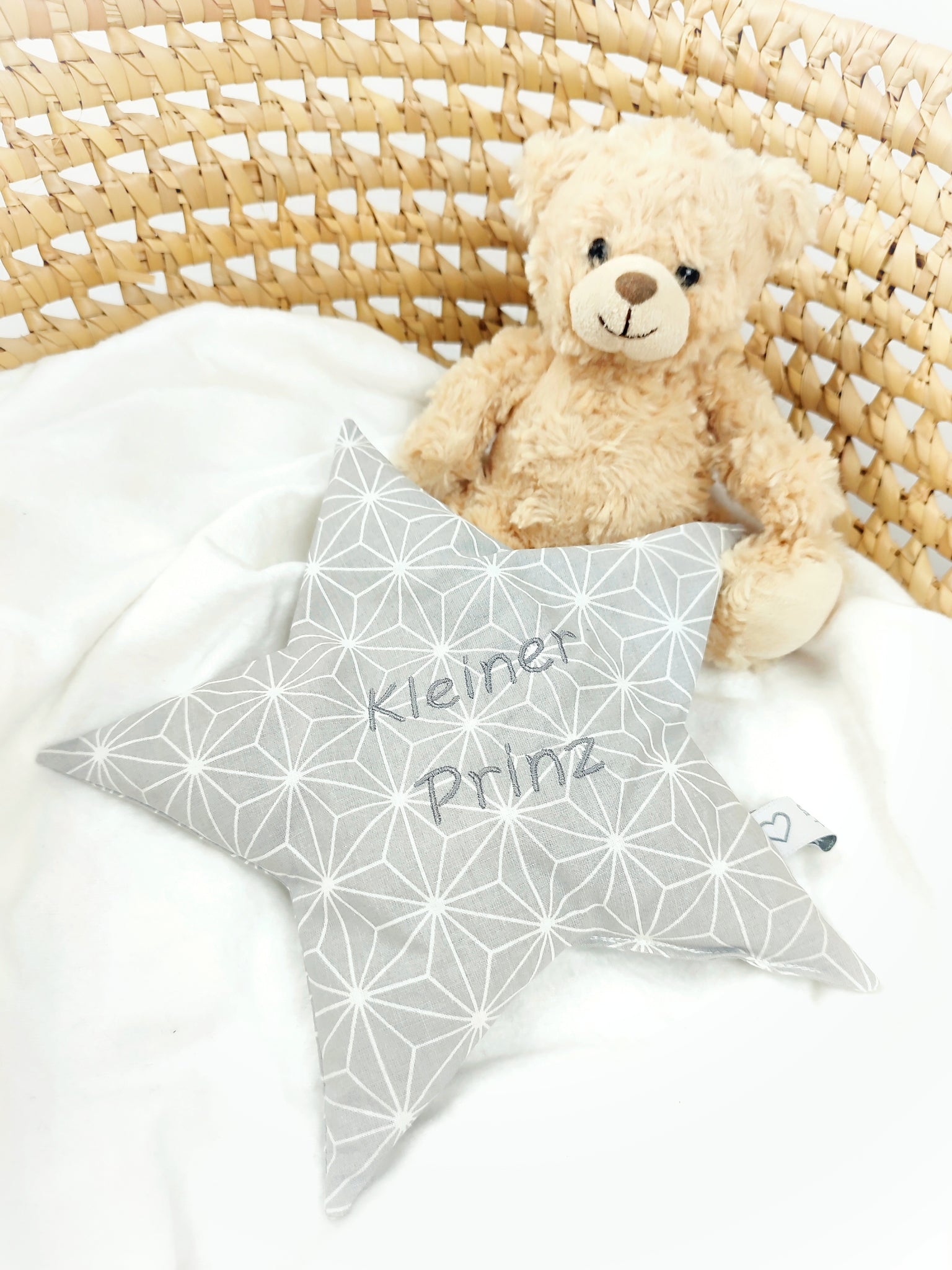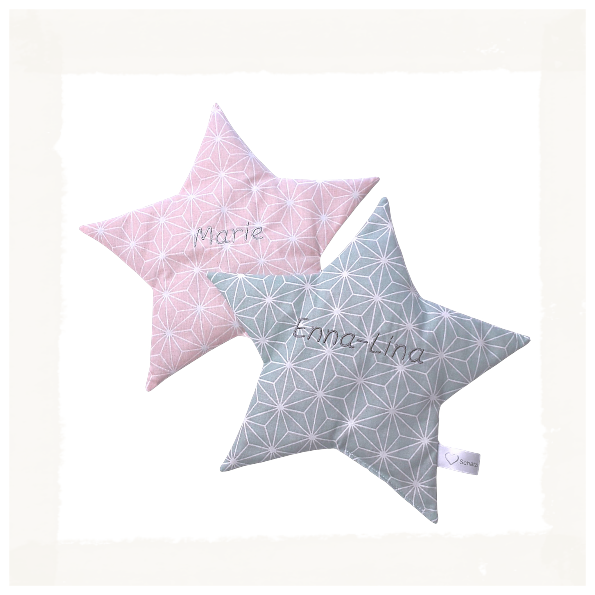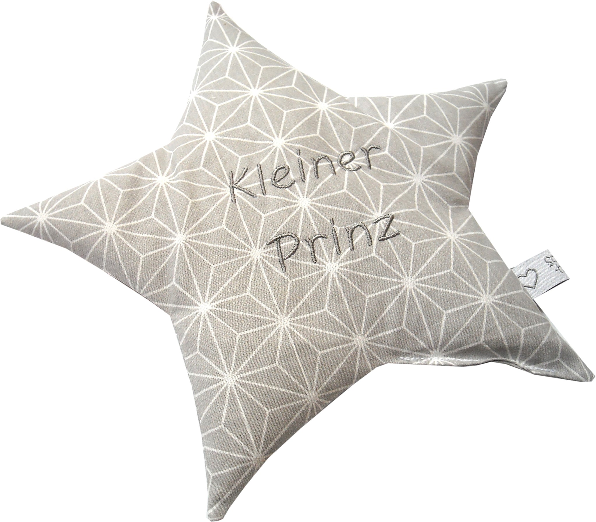 Das Wärmekissen mit dem dezenten Grafikstoff, in Form eines Sterns, wird wahlweise mit Kirschkernen oder mit Dinkel gefüllt.