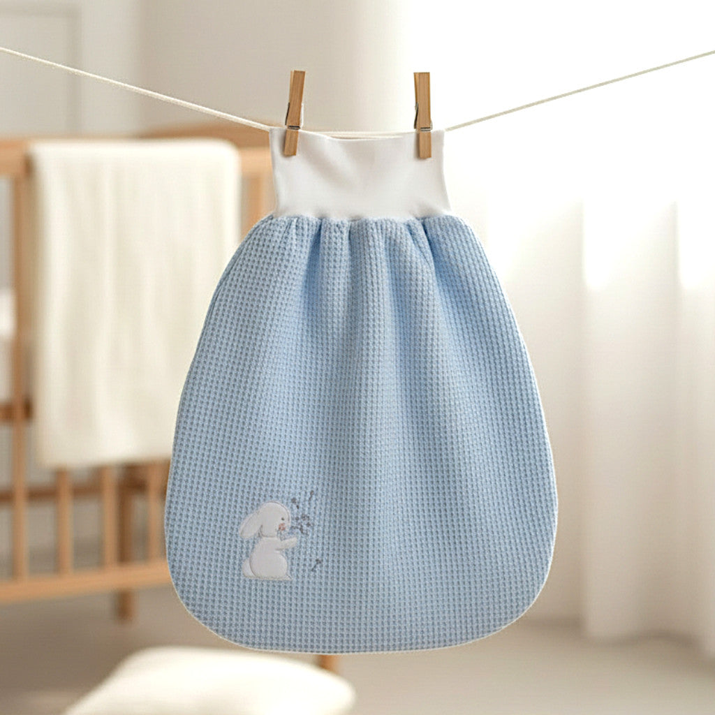 Dieser handgefertigte Strampelsack aus hochwertigem Waffelpiqué vereint zeitloses Design mit hohem Komfort und einer ganz persönlichen Note. Das breite, weiche Bauchbündchen sorgt für einen optimalen Sitz und viel Bewegungsfreiheit – ideal für entspannte Nächte und gemütliche Tage.