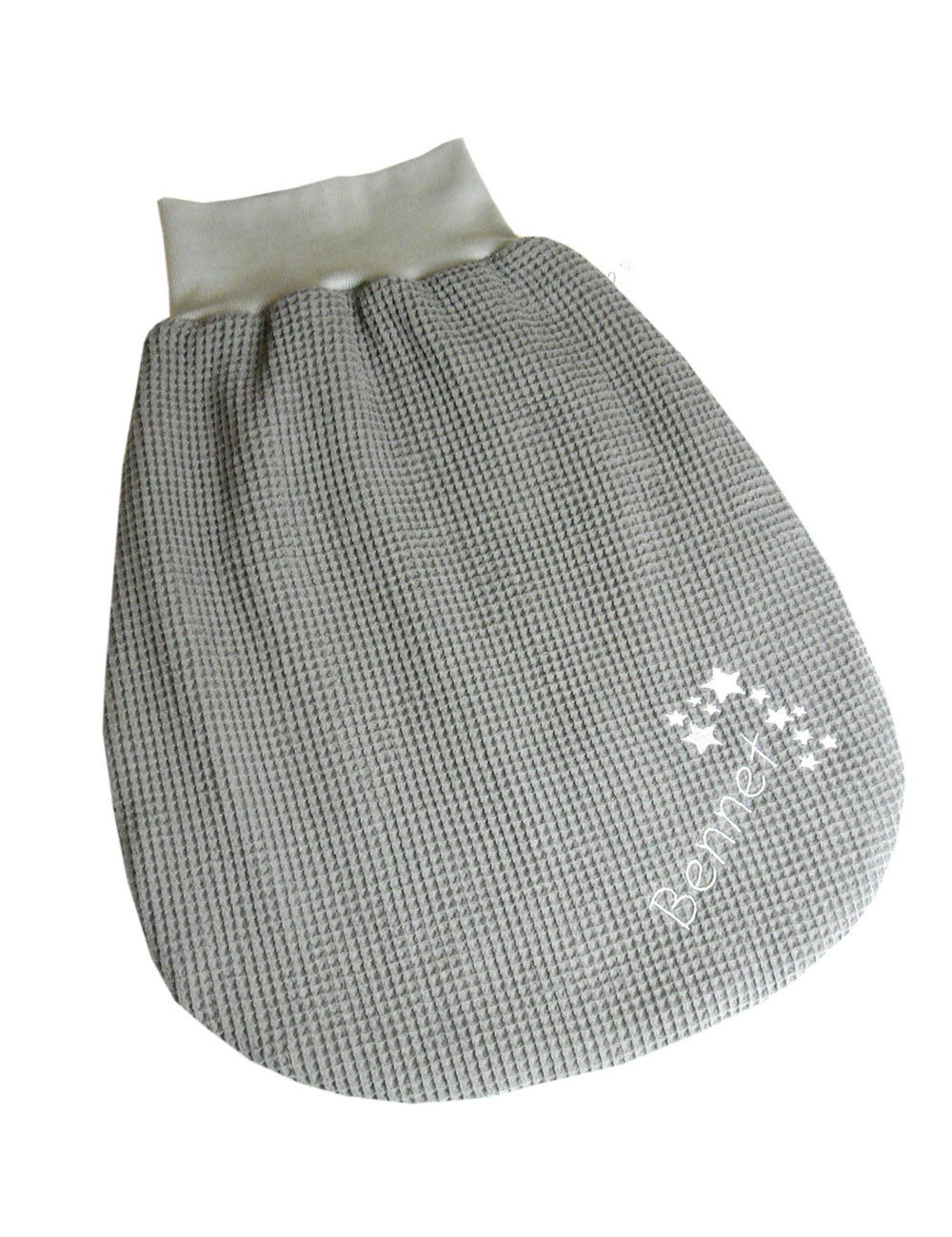 Der Strampelsack ist aus hochwertigen Waffelpique gefertigt, als Innenteil wird wahlweise Molton (für die kälteren Tage/Nächte) oder Baumwolle verwendet.