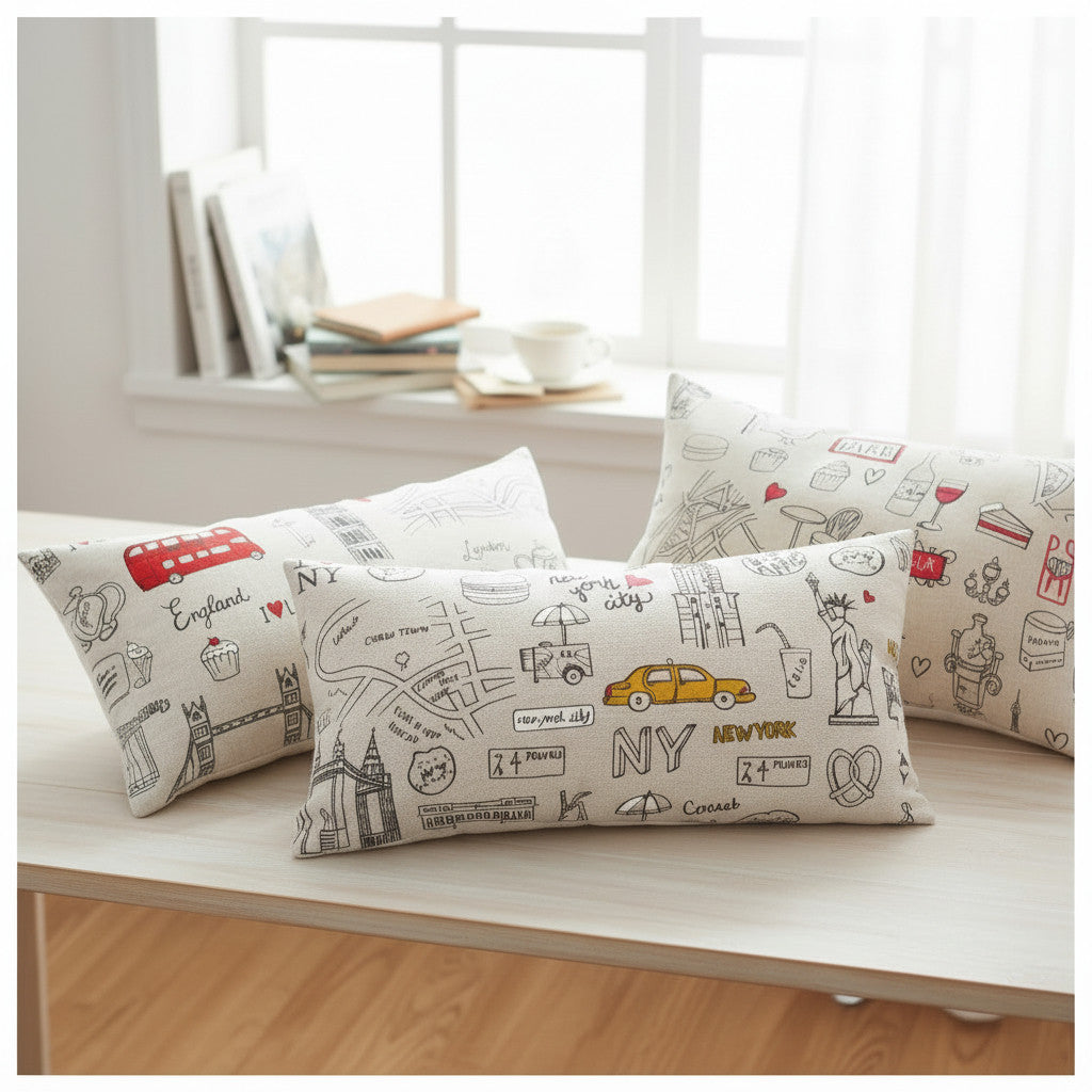 Das Stoffdesign ist mit coolen Grafiken aus New York, London und Paris.